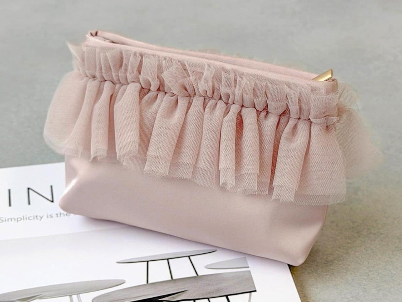 淡いピンクカラーをベースに、ロマンティックなフリルのチュールがあしらわれたこちらのポーチは、日常にほんのり華やぎを足してくれそうな予感。光沢感のある生地で、上品さと高見え感があるのもうれしいところ。内側には小物を収納できる2つのポケット付き。見た目の可愛さだけでなく、実用性も抜かりなしです。