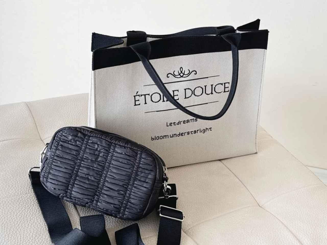 「しまむらでバッグ購入しました」と@naco_roomsさんが紹介している、2つのバッグ。1つは、パキッとした白 × 黒のコントラストが爽やかな、英字プリントのトートバッグ。スクエアなフォルムが端正な雰囲気で、きれいめコーデにも馴染みそうです。もう1つはスマホや鍵など貴重品が入るサイズ感の小さめショルダーバッグ。どちらも幅広いコーデに馴染みそうなバッグなので、2個持ちしてもシャレ見えしそうです。