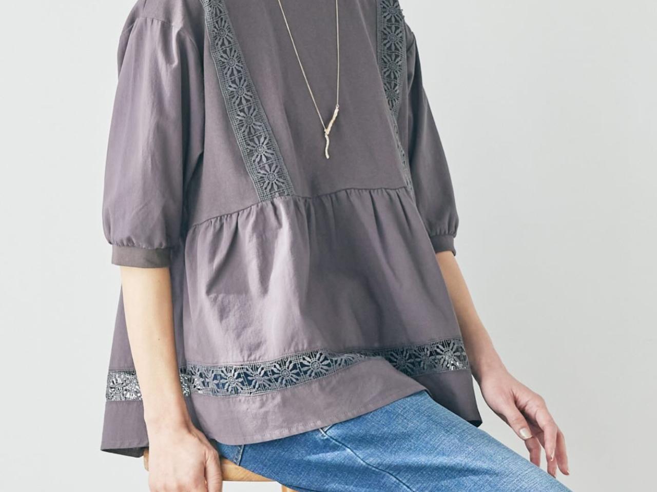 一見ブラウスのように見えながら、実はカットソー素材で着心地のよさそうなプルオーバー。公式Instagramによると「動きやすく、締め付け感のない着用感」とのこと。レースの隙間から覗く肌が、女性らしい奥行きのある表情を演出。シックな色味の中に、首元の細めのリボンがアクセントになり、さりげない甘さを添えます。