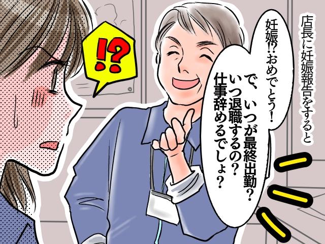 産休に入る日のことを聞かれているのだと思った私は、「まだ人事部に報告していないので、分かり次第また報告します」と伝えました。すると、店長から衝撃の言葉が。「いや、産休じゃなくて、いつ退職するの? 仕事辞めるでしょ?」