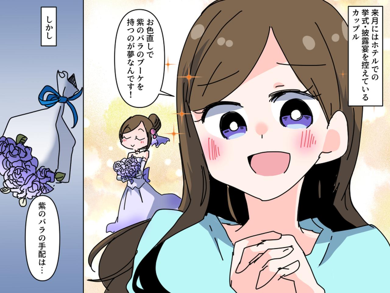 新婦のA様は以前から、お色直しに「紫のバラのブーケ」を持つのが夢だったそうで、そのために淡い紫のドレスまで既に用意されていました。ところが、ホテルの装花担当者から「8月に紫のバラは手配できない」と断られてしまったそうです。他にも何軒かフラワーショップに相談したものの、どこも返答は同じ。最後の望みをかけて、私たちの店を訪れたのでした。