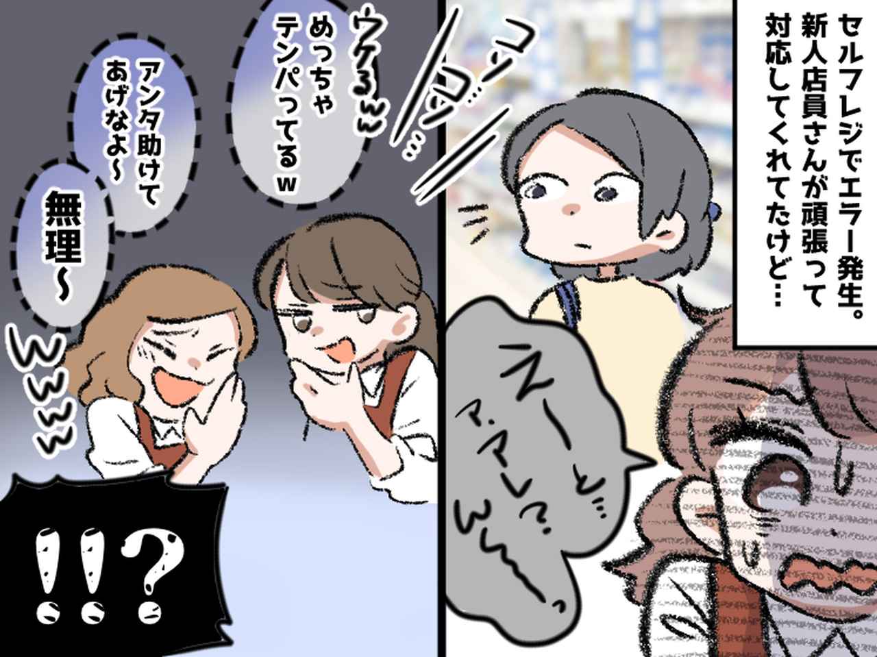 そこにやってきたのは新人らしき女の子。オドオドしながらも一生懸命レジの操作を試みていましたが、なかなか解決できず四苦八苦している様子でした。