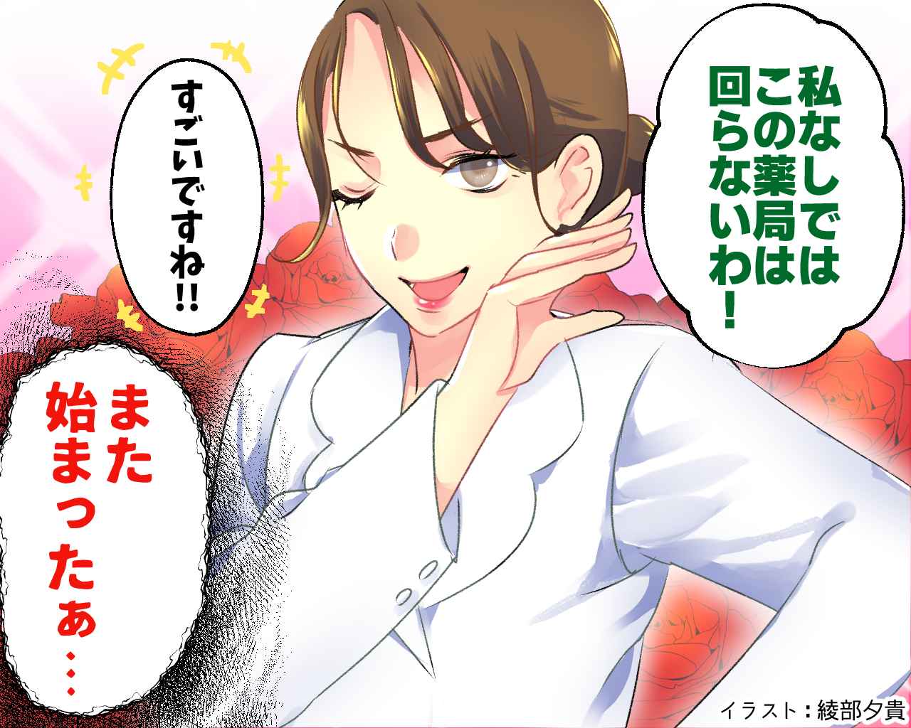 昼休みになると、相澤さんの「武勇伝タイム」が始まります。「この前の薬の発注ミス、私が全部チェックして防いだの! 危なかったわ~」と得意げに話しますが、実際に発注ミスを防いだのはシステム担当と他のスタッフの二重確認。