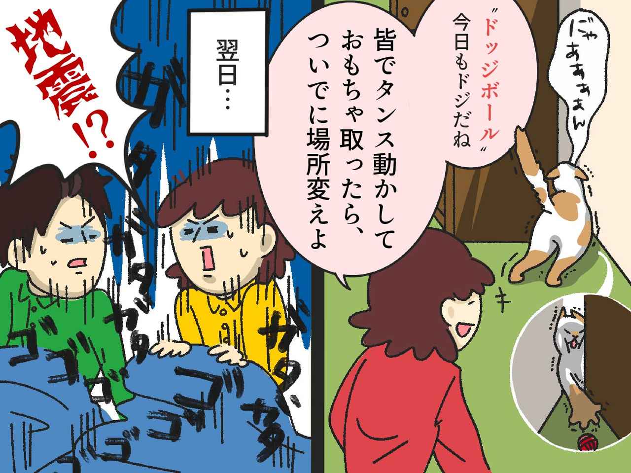 ドッジボールがおもちゃを隙間に落としていなければ、模様替えをしていなかったはず。ドッジボールの“ドジ”が、結果的に母を守ってくれたのです。