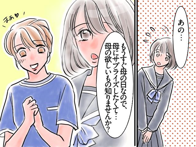 私は脱毛サロンで働いています。ある日の午後、予約のない中学生のお客様が一人で来店されました。いつもはお母様と一緒にいらっしゃる方だったので、「何か忘れ物でしょうか?」とお声をかけてみると、少し照れたように「もうすぐ母の日なので、母にサプライズしたくて……母の欲しいもの、知りませんか?」と尋ねられます。