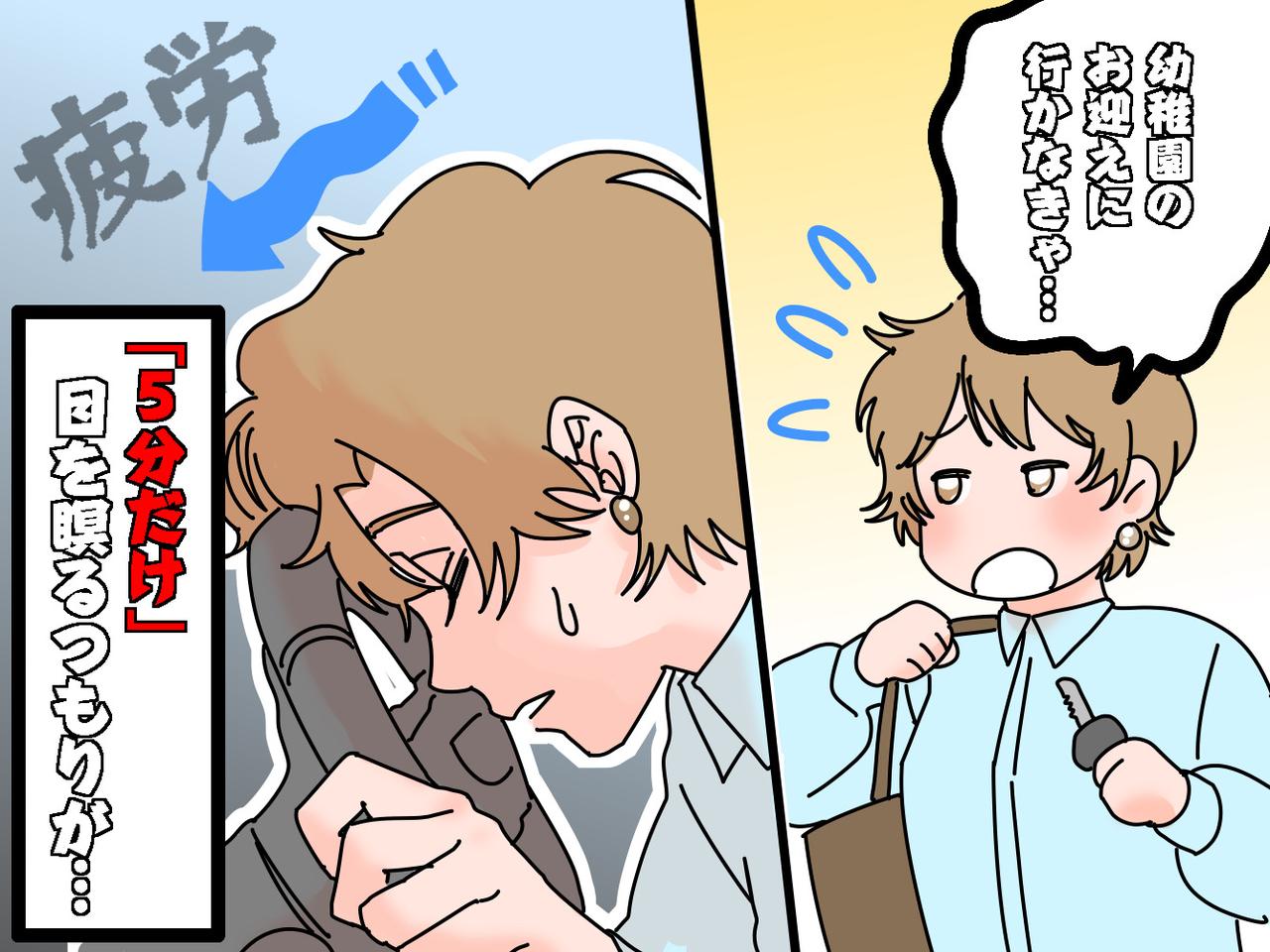 当時、幼稚園のお迎えは16時まででした。仕事が終わるのは15時半。いつもは終業と同時に駐車場に走り、車に飛び乗って幼稚園に向かっていたのですが、その日はどうにも体が重くて……。「5分だけ目を瞑ろう」と思い、車の中でタイマーをセット。ハンドルにもたれて仮眠をとることにしました。