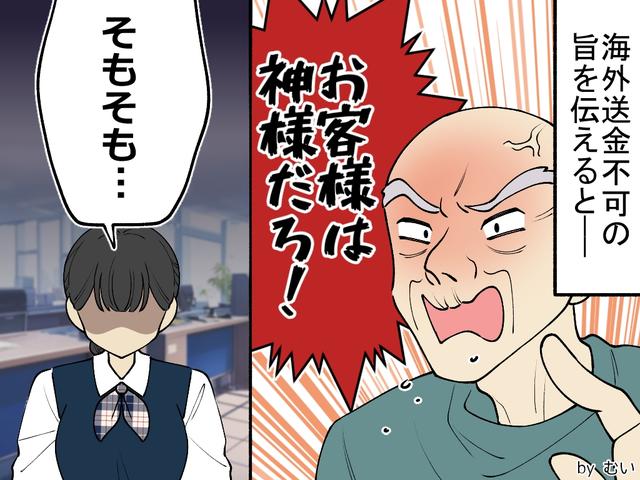 「いい加減にしろよ!」「そんな事情、こっちは知らないよ!」「銀行が無理ならどうするんだ! 今すぐ代わりに調べろ!」「送金できるまで帰らないからな!」「いっそ君が間違えたふりをして、こっそり送金手続きしてよ!」「君だって、今まで処理を間違えたことだってあるでしょ?」次々と理不尽な要求が飛んできます。