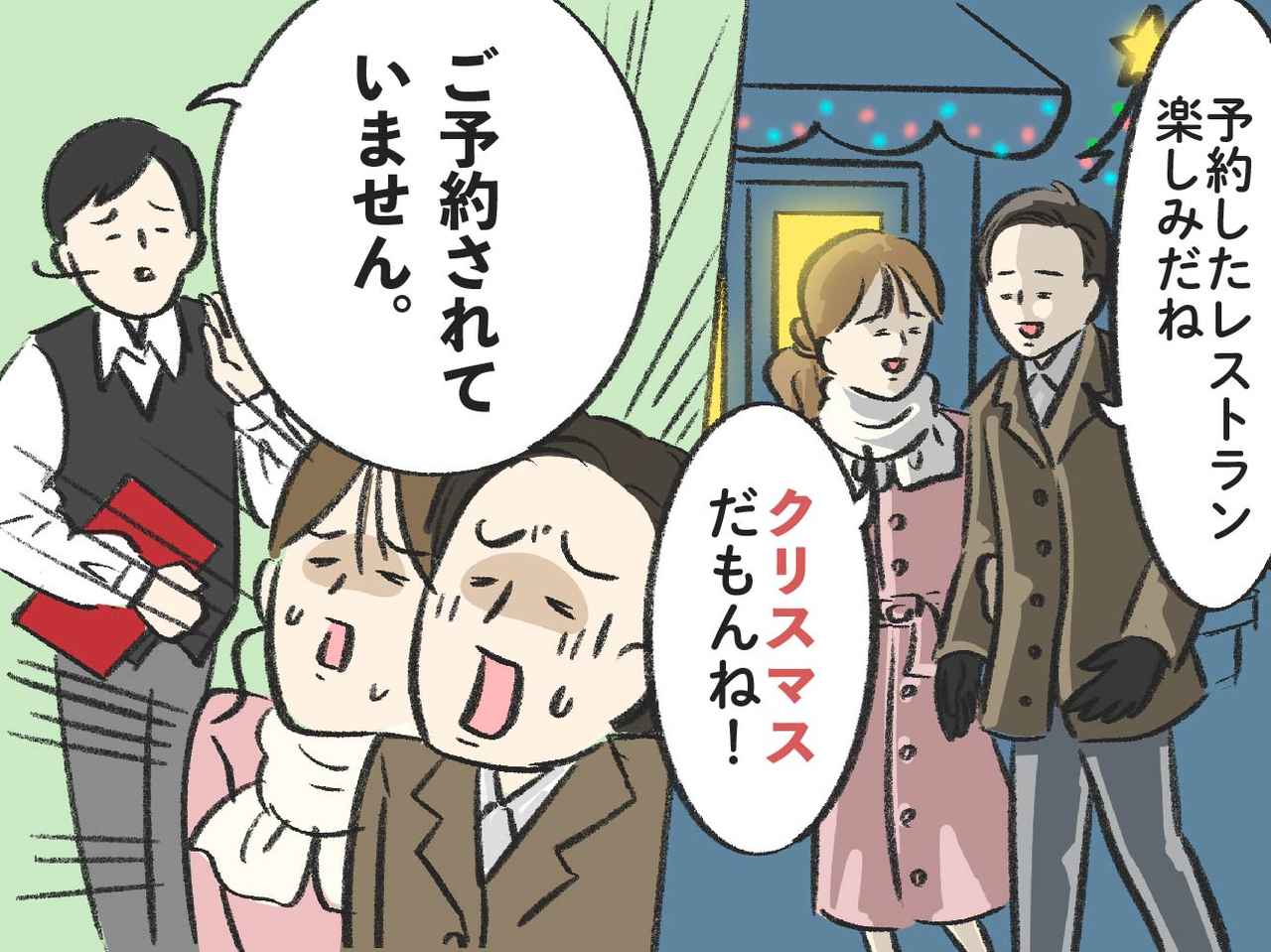 そして迎えたクリスマス当日。お気に入りのワンピースに着替え、キラキラ輝くイルミネーションを眺めながら、旦那とレストランへ向かいました。2人とも浮き立つ気持ちで店の扉を開けたその瞬間、思わぬ言葉が飛び込んできました。