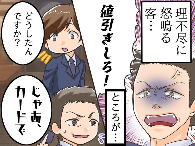 「えっ、あ、いや……」先ほどの威勢は一瞬で消え、男性の顔はみるみる赤く染まります。居酒屋で値切って揉めているところを同僚に見られるのは、さすがに気まずかったのでしょう。「じゃあ、カードで」男性は慌ててクレジットカードを差し出し、早足で店を後にしました。