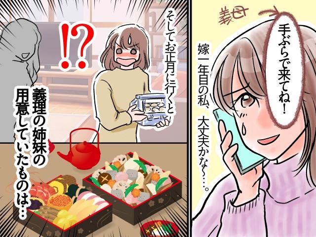 結婚して初めて迎えるお正月。元旦の夜は義実家宅でお祝い & 食事会が開かれることになっていました。「嫁として、何か用意や手伝いをしたほうがいいのかも」と感じ、義母に電話で相談してみましたが「気にしないで! 顔を見せてくれるだけで十分だから、手ぶらで来てね」の一点張り。