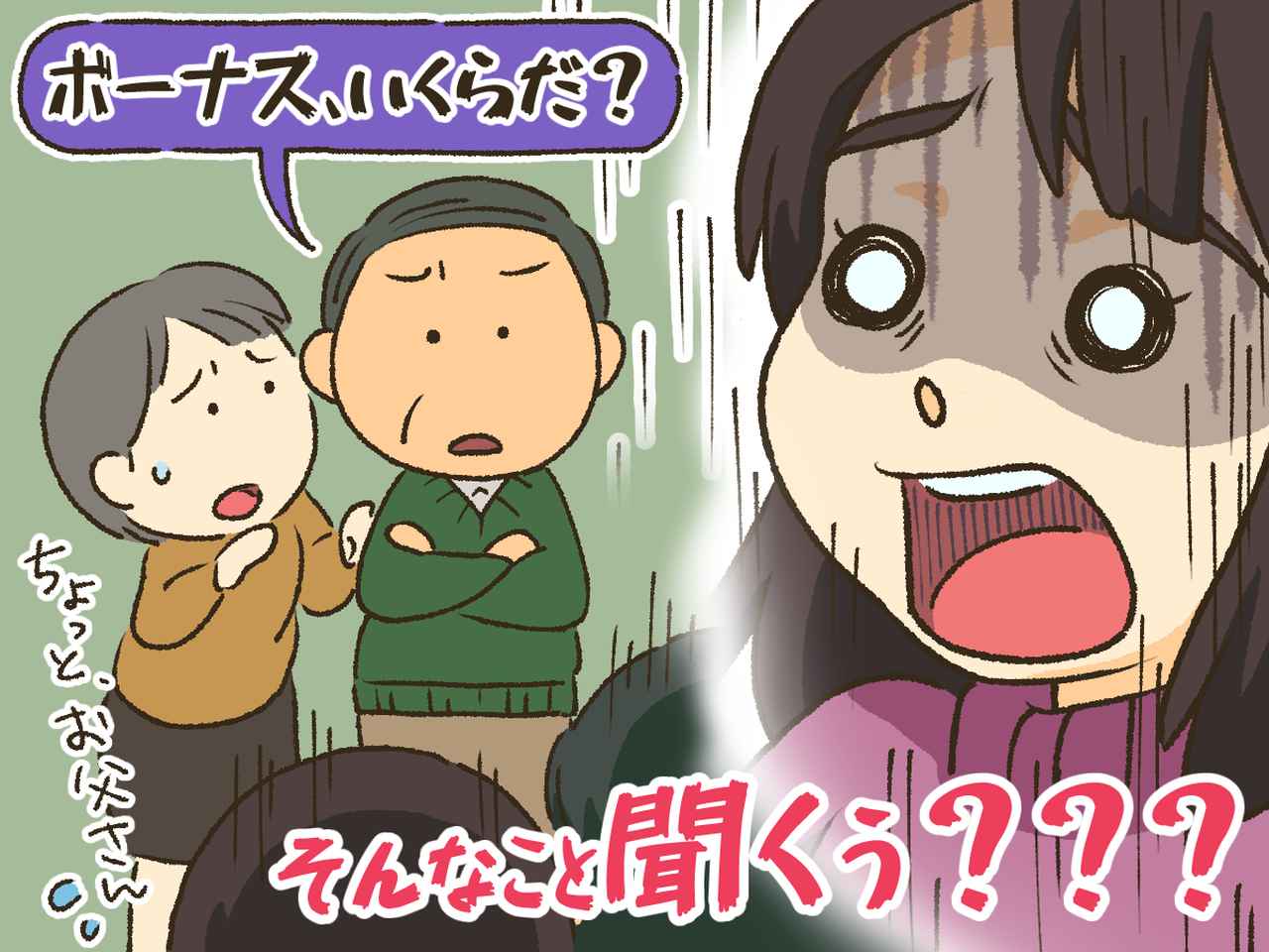 玄関で挨拶した直後でした。義父が開口一番、「で? 〇〇くん(夫)のボーナス、いくらだった?」と当然のように尋ねてきました。夫が答えに詰まると、今度は私の方を向き、「あなたのボーナスはいくら?」と同じテンションで聞いてきたのです。