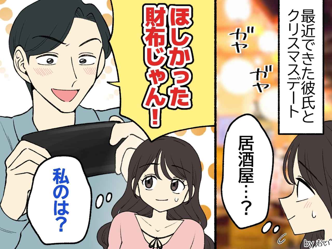 思い描いていた初めてのクリスマスデートとは違いましたが、「会えるだけで嬉しい」と気持ちを切り替え、私は藤田さんに「はい! クリスマスプレゼント!」とプレゼントを渡しました。受け取った藤田さんは「え! 俺が欲しがってた財布じゃん! 高かったでしょ? ありがとう〜!」と大喜び。