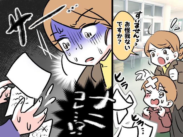 さらに翌日。息子が塾の大事な宿題を学校に忘れてきたと言い出しました。普段クールな息子が半泣きで「一緒に取りに行って」と頼むので、しぶしぶ三日連続で学校へ行くことに。すると、廊下には昨日話した女性の姿が。急いでいた息子は、内履きを履かず靴下のまま走り、滑って彼女にぶつかってしまいました。