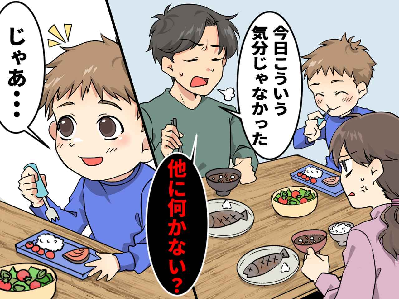 しばらくして、子どもが夫の顔を見て、無邪気な口調で聞きました。「パパ、何食べたい?」「らーめん? やきにく?」少し考えるような間を置いてから、こう続けたのです。「今日、パパの食べたいものないんやって〜。じゃあ、お外で食べておいで!」
