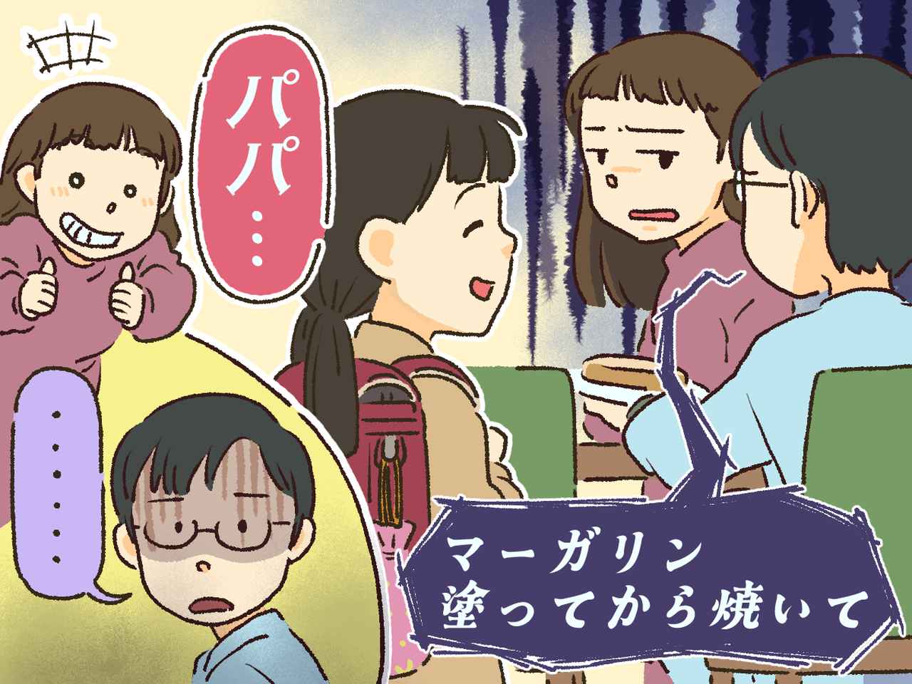 そこへ夫が、まるで休日のカフェにでも来たかのような表情で席につきました。焼き色をチェックしながら、ぽつり。「ちょっと焼きすぎじゃない? マーガリンはさ、塗ってから焼いたほうがうまいんだよ〜」