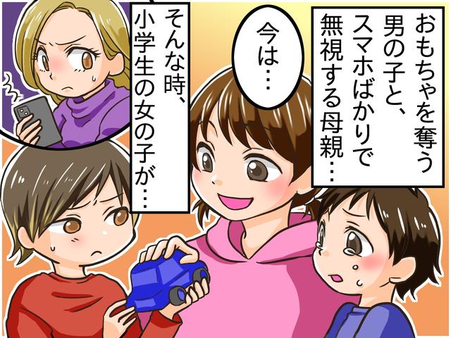 そんなとき、小学校低学年くらいの女の子が遊び場に入ってきました。状況を一通り見渡したあと、その子は男の子に向かって「順番だよ。今はこの子が使ってるよ」「一緒に遊ぼう!」と、やわらかい声で話しかけました。