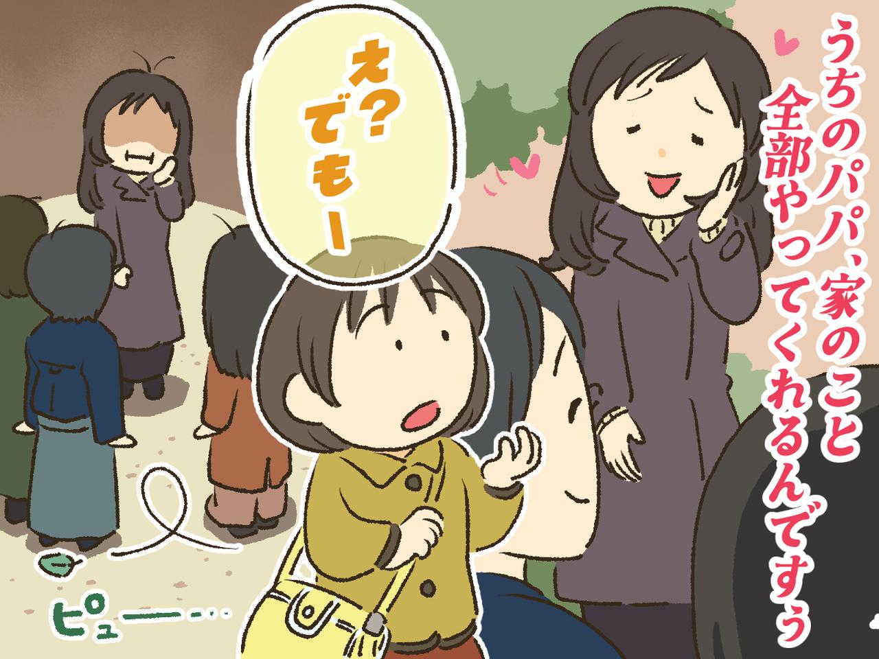 ある日の園帰り、数人で立ち話をしていたときのことです。その日も片岡さんは、いつも通りのテンション。「昨日もね、私ほとんど何もしなかったの」「全部パパがやってくれて」慣れ親しんだ流れでした。