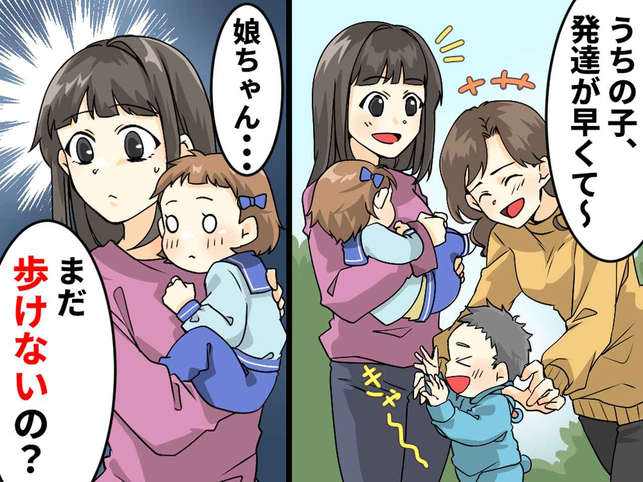 ある日の送迎で、また同じようなやり取りになりました。その会話を近くで聞いていた別のママ・雅子さん(仮名)が、自然な流れで話に加わってきました。雅子さんは笑いながら「うちの子が歩いたのなんて、1歳半のときだったよ〜!」と言いました。