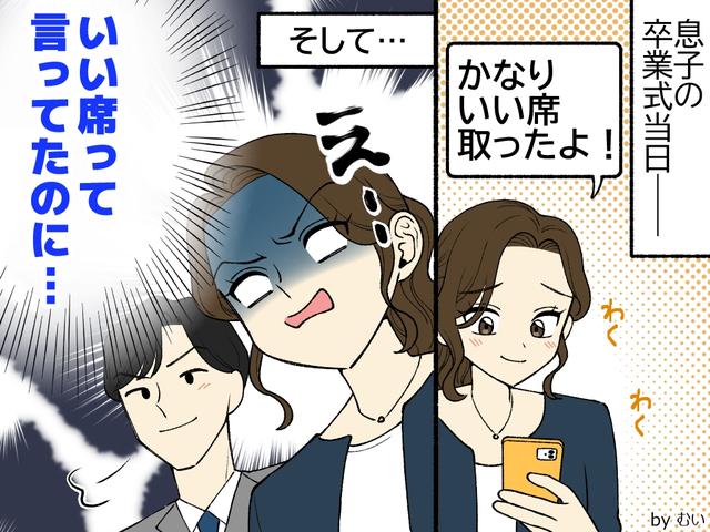 息子の小学校の卒業式の日。私は朝から、そわそわしていました。「席取りはパパに任せるね」と言うと、夫は笑って「任せて!」と返し、先に出発。