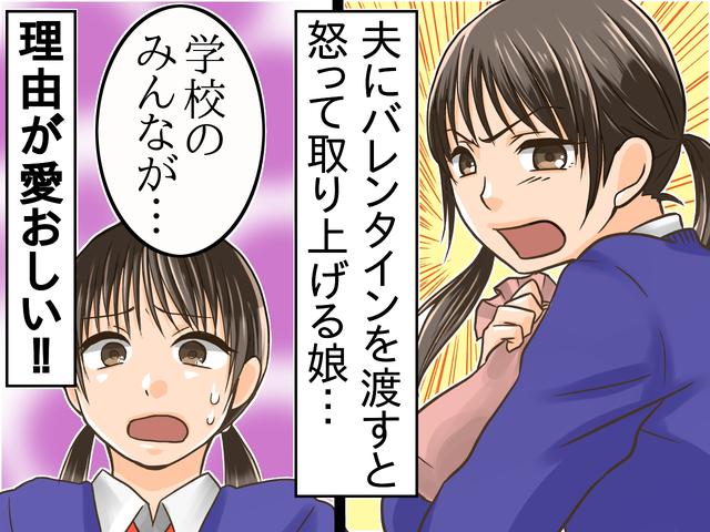 バレンタイン当日。久々に早く帰宅した夫に「私と娘から」と渡すと、夫は「ありがとう」と笑顔でラッピングを開け始めます。すると娘が突然それを奪い、「あげちゃだめ!」と取り上げたのです。あまりの速さに驚きを隠せない夫と私と弟たち。