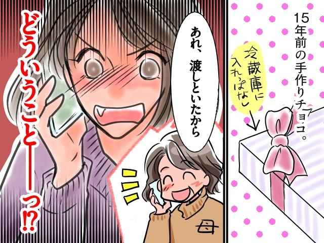 私は「そんな15年前のチョコを本人に渡したの?! 気持ち悪がられるに決まってるじゃん!」と怒りと恥ずかしさが入り混じった感情で母を責めてしまいました。母は「そんなつもりじゃなかった、ごめんね」としおらしく謝り、私も「混乱して責めちゃった、ごめん」と返し、釈然としないまま電話は終了。