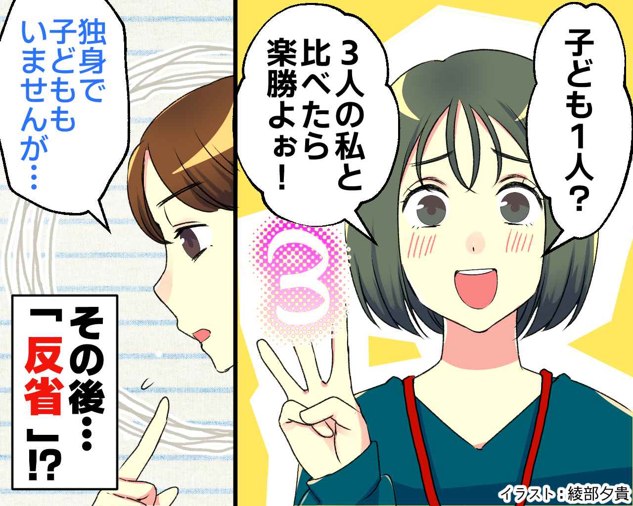 ある日、さちえさんは同じ部署の30代の独身女性について、「独身で子育てしていないのにいつも早く帰って協力的じゃない」と発言。それを聞いた本人が事情を説明します。母の介護が必要で、父も体が弱いこと。家族で協力しなければいけないこと。「子育て以外にも、いろいろな事情を抱えている人もいるんですよ」と。