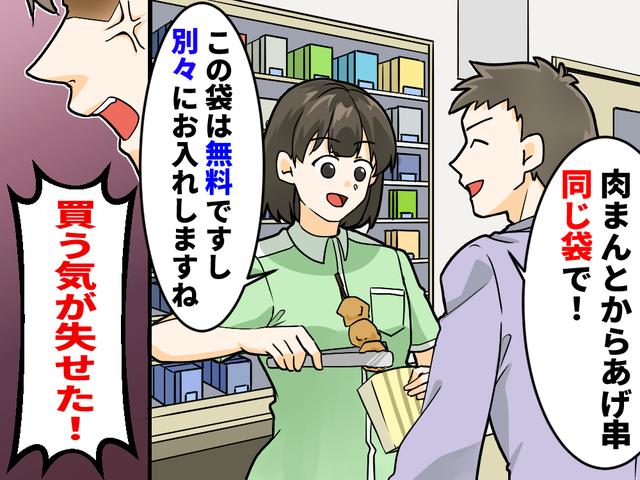 ある日の昼食時間帯、店が混み合っている中でそのお客様がご来店。いつものように「肉まんとからあげ串、同じ袋で!」と注文。スタッフが「この袋は無料ですし、別々にお入れしますね」と対応すると、お客様は突然激怒。