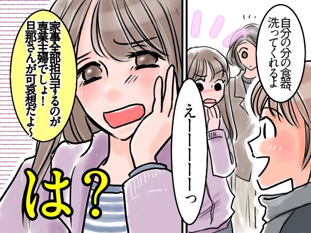 専業主婦で、幼稚園に通う息子がいる私の友人・未来さん(仮名)。夫とは上手く家事の役割分担をして、お互いが無理なく過ごせるよう工夫しているそうです。ところが、そんな話をするとママ友のひとりに「専業主婦なら全部やらないと、旦那さんが可哀想」と言われてしまい……!?
