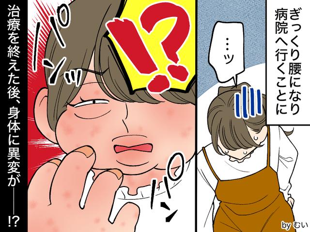しかも湿疹は皮膚だけでなく気管支にも出てしまったようで、呼吸がしにくくなってきました。そしてもちろん、痛み止めの処置をしたとはいえ腰は激痛のまま。そのうえ全身が腫れ上がり、息苦しい。