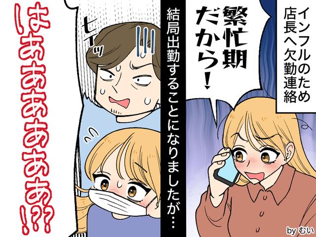私の職場は夫婦経営の美容室で、店長である夫と同じ職場で働く奥さんがいます。インフルと診断された翌日は奥さんが出勤しておらず、顔を合わせることはありませんでしたが、翌々日、職場で奥さんと顔を合わせました。