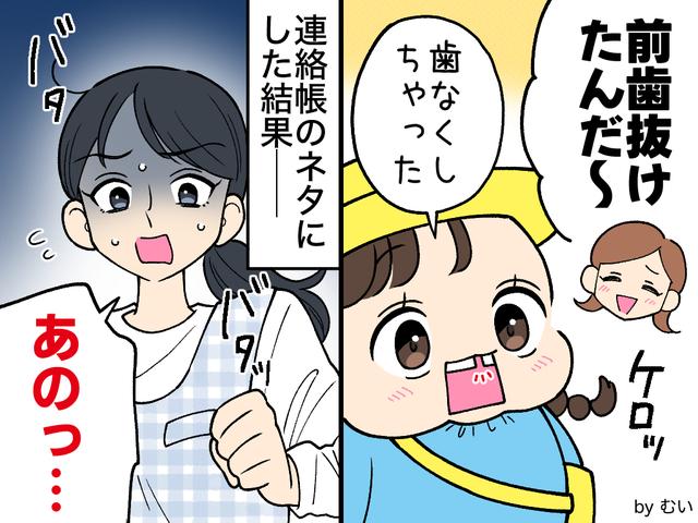 私が連絡帳に書いた「園にいる間に、いつの間にか歯が抜けていたようです(笑)」という文言は、皮肉めいたクレームに受け取られてしまったのでした。平謝りする先生たちに、ただ恐縮しっぱなし。なんとか誤解を解き、その場は落ち着きました。