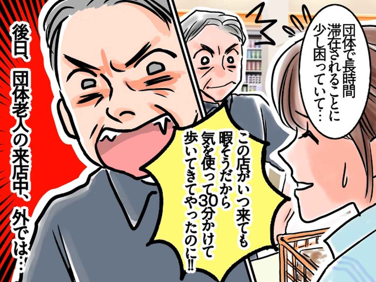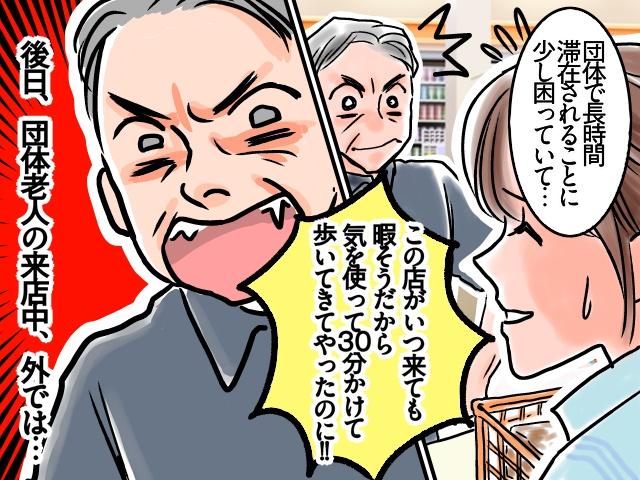 翌週、団体客が来店した際、Dと鉢合わせないようバックヤードで品出しをしていた私。すると外で騒ぎ声が聞こえ、恐る恐る覗くと数台のパトカーと警察官、そして激怒する老人たちの姿が。