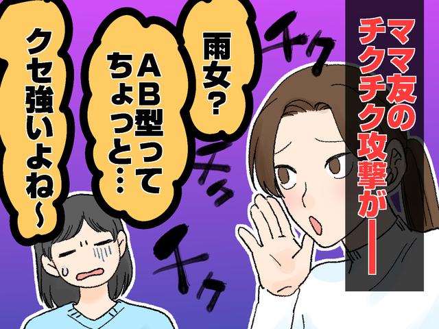 また別の日。みんなでのランチ帰りに、偶然会った他のママと立ち話をして別れた直後。原田さんが「あの人AB型だからちょっと苦手なんだよね。AB型の人って気が遣えない人が多いじゃない?」とさらり。さらに「でもA型も考えすぎたり細かすぎて嫌なんだよね」と続けます。