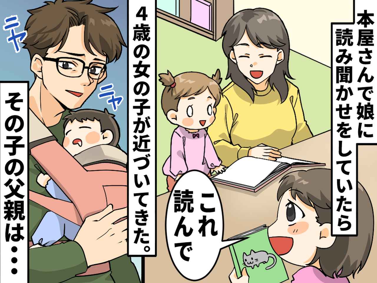 その本屋さんには、靴を脱いで座り、ゆっくり絵本を読めるキッズスペースがありました。娘に絵本を読んでいると、4歳くらいの女の子が近づいてきて、「なに読んでるの?」と話しかけてきたのです。
