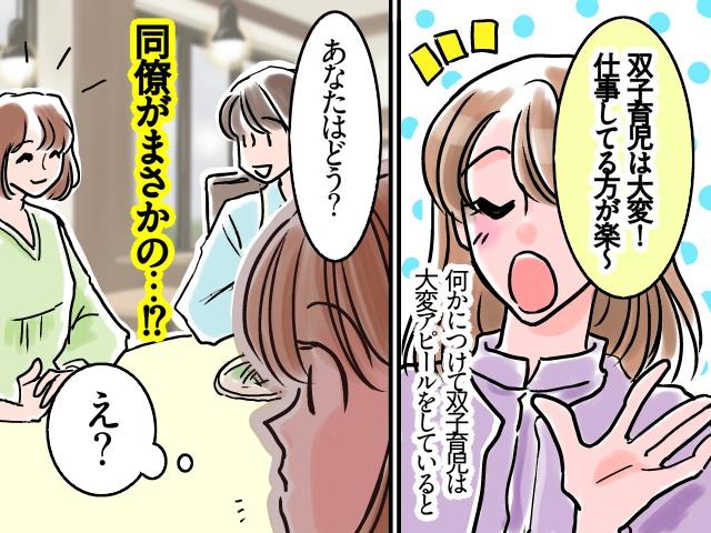 私は30代の会社員。同期のAは双子の母で、育休も半年ほどで切り上げてフルタイム勤務をしています。そんなAの口グセは「双子育児に比べたら仕事の方が楽!」「双子育児に比べたら1人っ子育児や兄弟育児の方が楽!」。何かにつけて双子育児の大変さをアピールしてきます。
