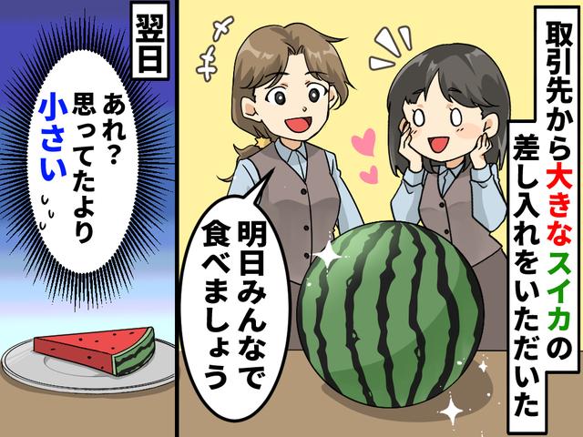私に見られたことに気づいた先輩は、悪びれる様子もなく「家族もスイカを楽しみにしててね」と笑いました。その時、たまたま給湯室に入ってきた後輩が、その状況を見て呟いたのです。「えっ……差し入れって、みんなで食べるものですよね?」