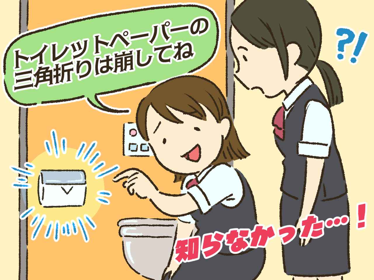 私はてっきり、先輩は紙の補充について話しているのだと思っていました。しかし、「全個室の見回り」には、もうひとつの意味が込められていたのです。「紙の補充と、ペーパーの三角折りがあったら崩しておいて。前にお客さんからクレーム受けたことがあって」