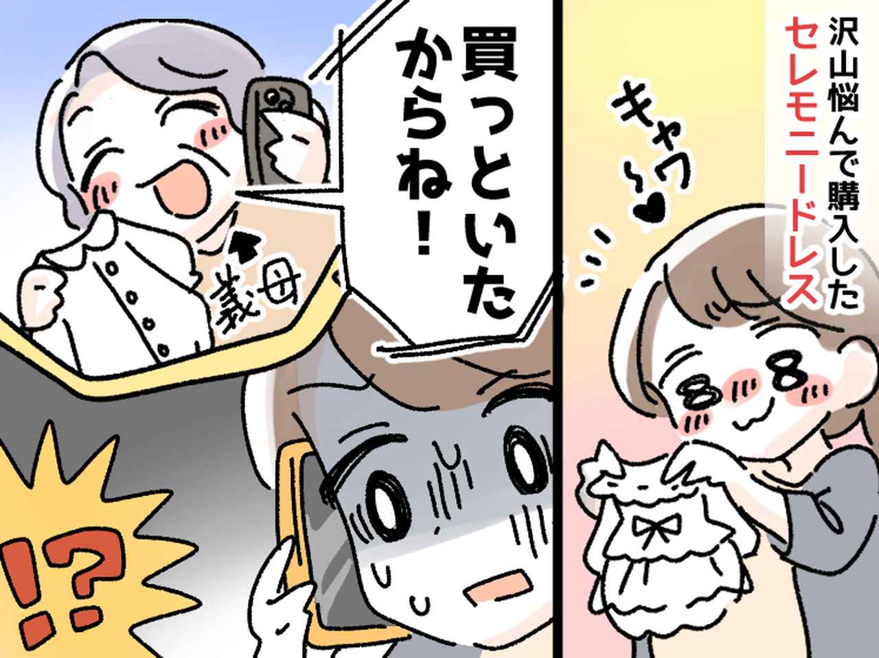 そんなある日、義母からメッセージが届きました。「かわいいセレモニードレス見つけたから買っといたよ!」思いがけない内容に、私はとても戸惑ってしまいました。(どうしよう……着せたいドレスがあったのに……)