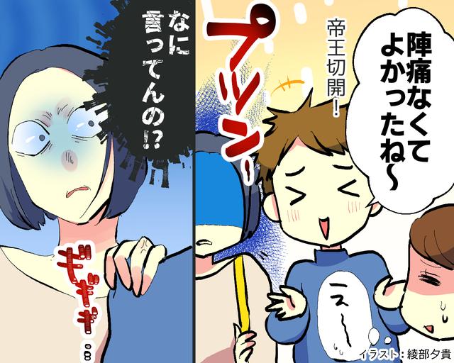 そんな中、夫と義母が面会にやって来ました。赤ちゃんの顔を見た夫は、安心したように笑いながらこう言いました。「でもまぁ、帝王切開だから陣痛なくてよかったね!」