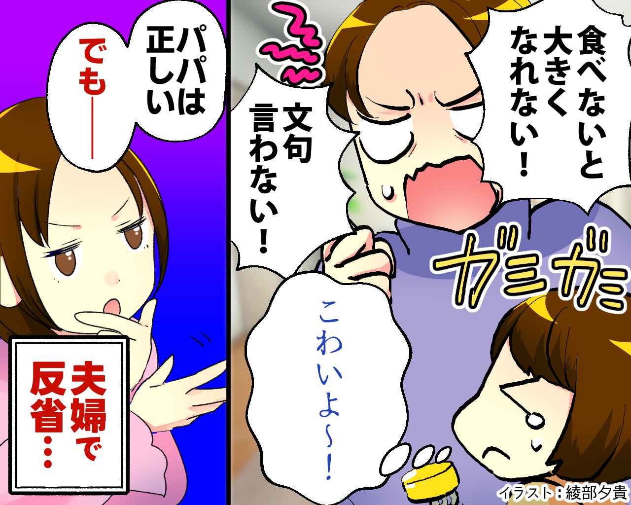 ある日の夕食時、4歳の次女が好き嫌いをして、ご飯を食べないことがありました。すると夫が、「食べないと大きくなれない」「せっかく作ってもらったのに文句を言うな」など、いわゆる正論で注意し始めました。