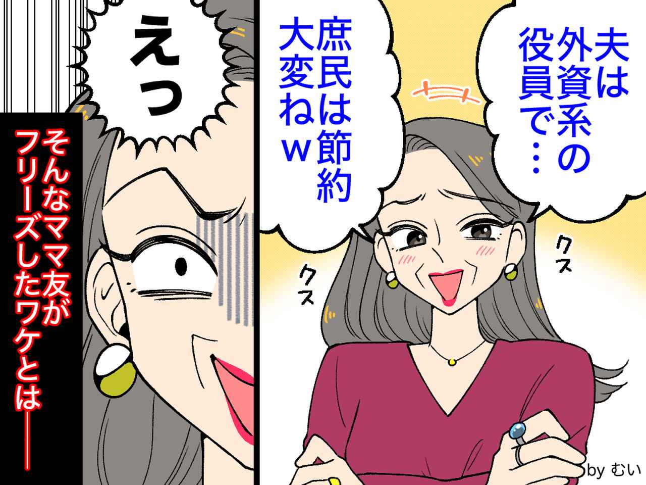 「えっ……専務……?」と、全く状況が飲み込めずにその場でフリーズするママ友。すかさず私が「いつも習い事では、奥様に大変お世話になってます〜」と笑顔で言うと、すべてを察した彼女の夫は「妻が何か失礼を!?」と平謝り状態に。