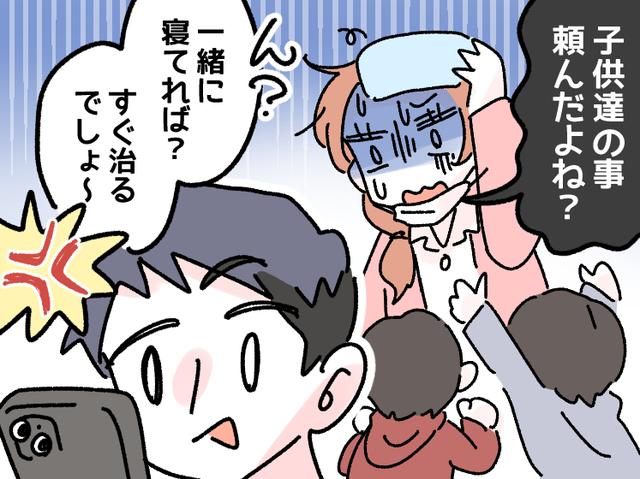 寒気がするので体温を計ると「39.2」という数字。「ごめん、本当に無理。子供たちのこと、お願いできる?」リビングにいる夫に頼むと、彼は「おう、見ておくよ」と軽い返事。その言葉を信じて、私はベッドへ潜り込みました。