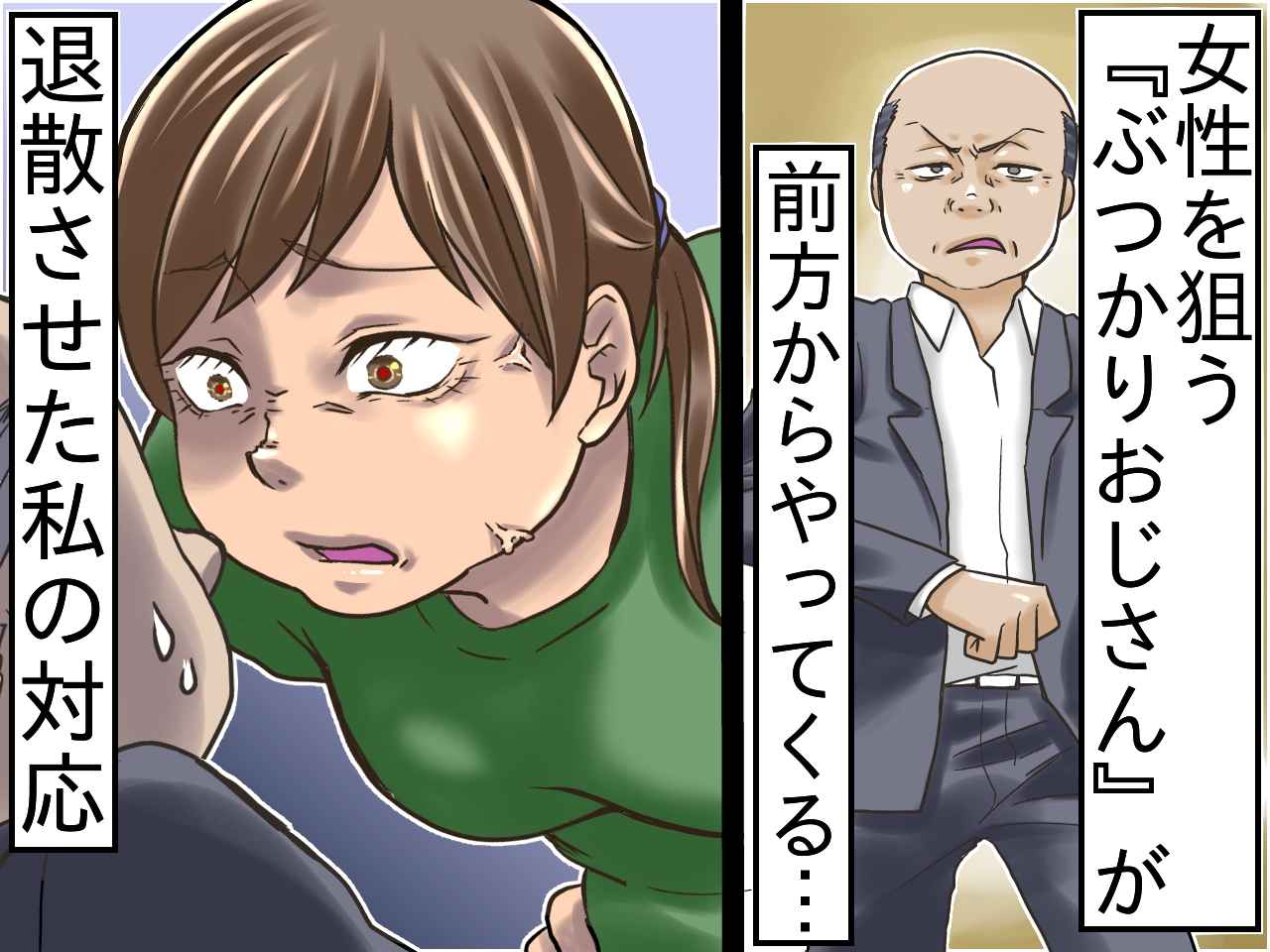 交通事故のように勢いよく飛ばされ、荷物があたりに散らばります。怯える顔で私を見上げるのは……おじさんの方。対する私は一歩も動かず、その場に仁王立ちして男性を見下ろしました。