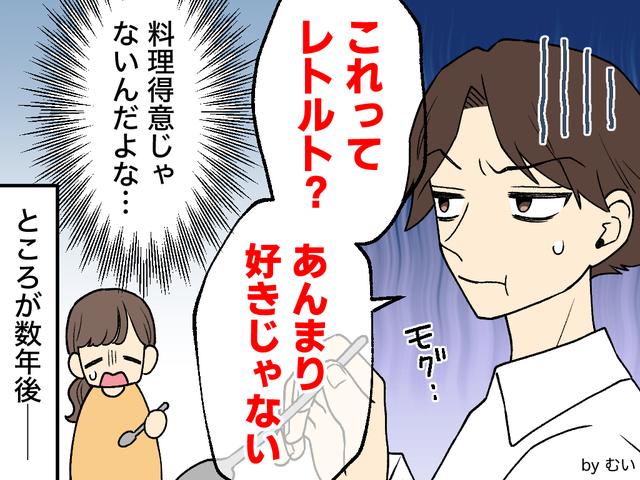ドキッとしながら「今日ちょっと時間がなくて、それはレトルトなんだ〜」と伝えると、夫は少し考えるような顔をしてから「こういうの使うのはな〜……」とぽつり。「ダメなの?」と聞くと、「あんまり好きじゃないかな」と返されてしまいました。