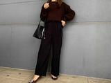 次はカラーニットと合わせたコーデ。ウエストがキュッと締まったデザインなので、クロップド丈のニットにしてウエストを強調することで、ウエストを細く、脚を長く見せる効果を狙いました。