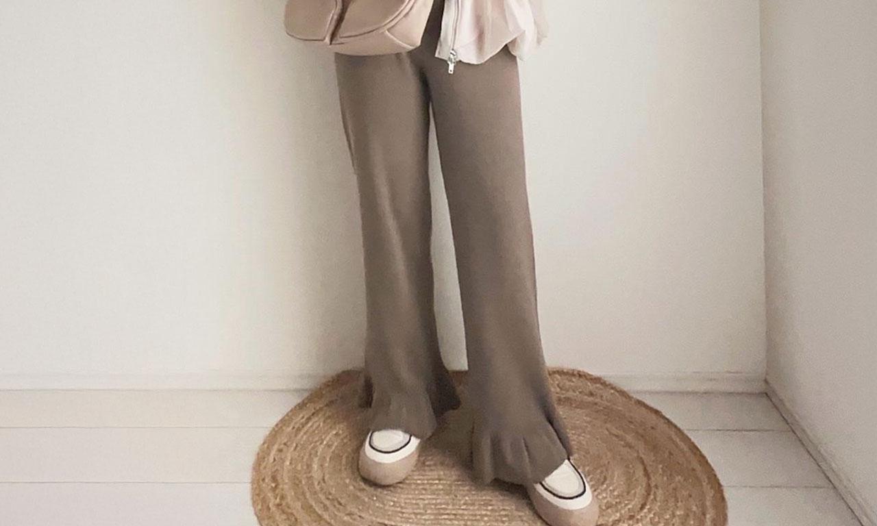 ニット素材ならではの快適さがありながら、すっきりとしたストレートラインでラフになりすぎないのが魅力。お出かけにもおうち時間にも馴染む万能な1本です。