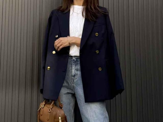 【green label relaxing(グリーンレーベル リラクシング)】の紺ブレにデニムを合わせました。インナーは【GU(ジーユー)】の「コットンスムースクルーネックT」。Tシャツ ✕ デニムに紺ブレを羽織るだけでオシャレ感がアップします♪