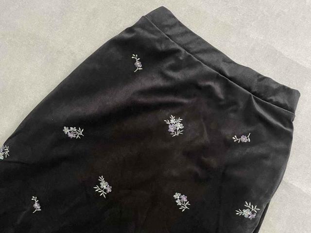 小花刺繍が施されたベロアスカートは、クラシカルで大人可愛い雰囲気。