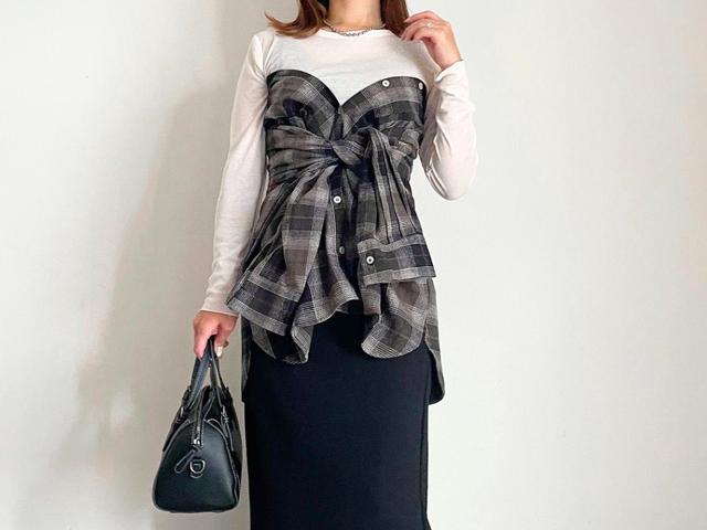 最後は上級者アレンジで「ビスチェ風」に。シャツのボタンの上から3つ目以外全て留め、下から通し袖を胸元で結ぶアレンジ方法は、大胆かつオシャレに決まりオススメです!