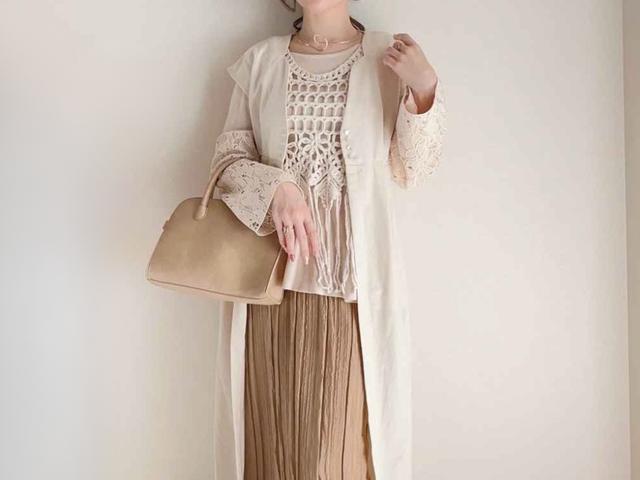 袖がレースになったニットの上にベストを重ね、ロングジレを羽織った上品な着こなし。ベージュトーンでまとめることで、全体が柔らかくまとまります。さりげない素材の組み合わせが奥行きを生むコーディネートです。